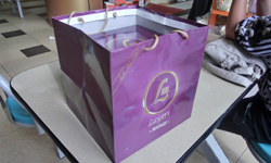 Our signature box, purple / maroon in color, and with golden logo