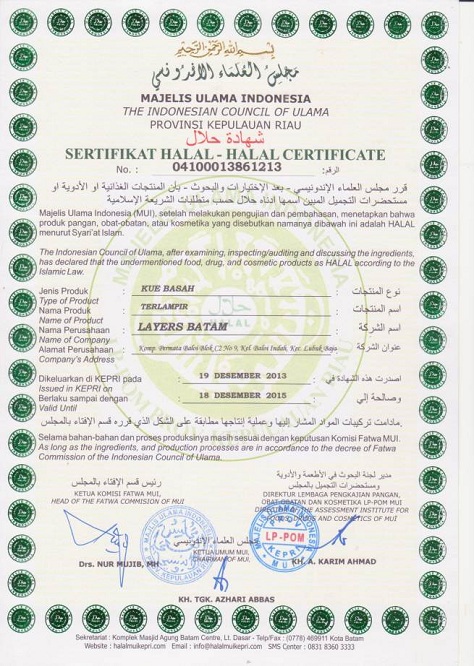 Layers Batam continues to be recognised. It has been awarded Halal certificate