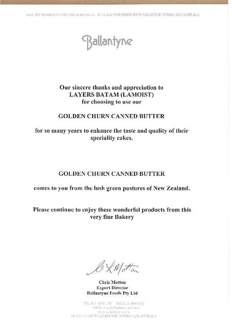 Special Appreciation Awards from the Manufacturer of GOLDEN CHURN BUTTER, Ballantyne group Australia